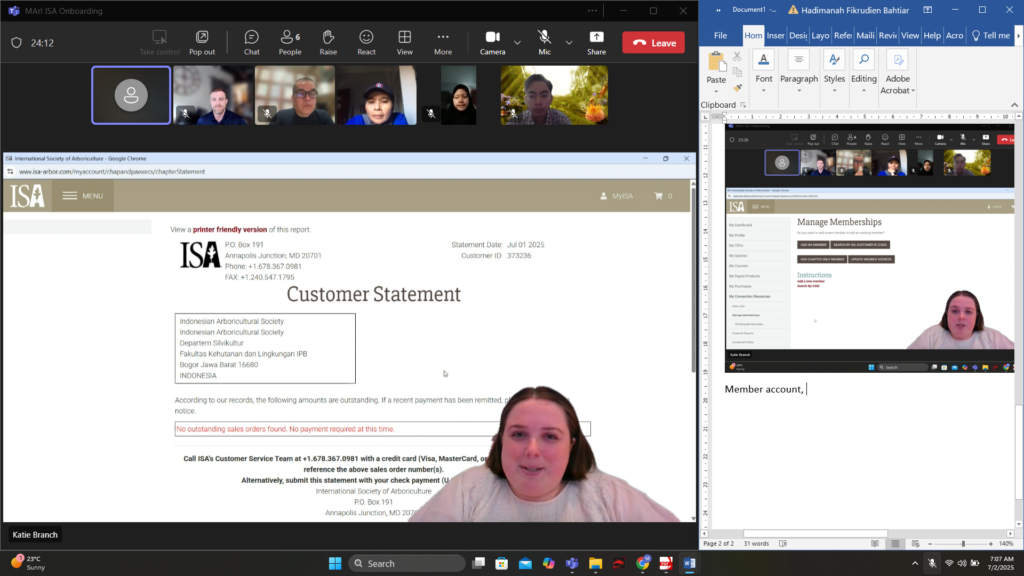 Pada hari Rabu, 2 Juli 2025, Masyarakat Arborikultur Indonesia (MArI) mengadakan pertemuan resmi bersama International Society of Arboriculture (ISA) secara online. Pertemuan ini merupakan kelanjutan dari proses aksesi MArI sebagai anggota komponen resmi ISA. Hadir dalam pertemuan tersebut perwakilan dari ISA, yaitu Matt dan Katie, serta perwakilan dari MArI, yakni Prof. Iskandar (Ketua), Prof. Lina Karlinasari (Sekretaris), dan dua asisten, Rachman dan Aini.
